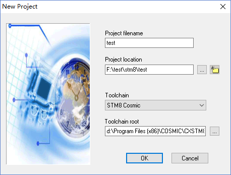 打开“ST Visual Develop”,File->New Workspace,选择“Create workspace and project”,接下来设置工程名称及目录等。工具链选择“STM8 Cosmic”,工具链根目录选择CXSTM8的安装位置。