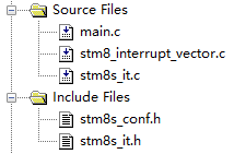 使用标准外设库中“STM8S_StdPeriph_Lib\Project\STM8S_StdPeriph_Template\STVD\Cosmic”路径下的“stm8_interrupt_vector.c”替换工程根目录下的同名文件。将“STM8S_StdPeriph_Lib\Project\STM8S_StdPeriph_Template”下的“main.c”、“stm8s_conf.h”、“stm8s_it.c”、“stm8s_it.h”文件复制到工程根目录下(同名则替换)。 将“stm8s_it.c”添加到工程的“Source Files”文件夹中,将“stm8s_conf.h”和“stm8s_it.h”添加到工程的“Include Files”文件夹中。