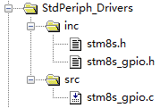 在工程中创建“StdPeriph_Drivers”文件夹,然后创建“inc”和“src”子文件夹。将所需的标准外设库中的头文件添加到“inc”文件夹下,源文件添加到“src”文件夹下。例如: