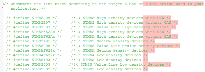 也可以通过移除“stm8s.h”文件中的有关目标器件预编译信息的注释来完成目标器件选择。