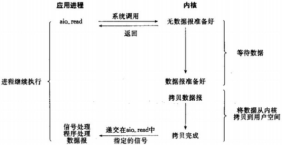 之所以说信号驱动的IO是半异步的,是因为实际读取数据到应用进程缓存的工作仍然是由应用自己负责的,而这部分工作执行期间进程依然是阻塞的,如上图中的后半部分。而在下面介绍的异步IO则是完全的异步。
